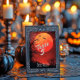 Cartão de número da mesa de casamento do Halloween com uma lua de cheio laranja brilhante, morcegos negros voadores, teia aranha e árvore morto. Placa de mesa de gótico que pode ser personalizada de acordo com as suas necessidades.