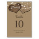 Papel kraft falso russo cartão de número da mesa de casamento com dois corações de burlap contra um papel kraft.. parece fundo enfeitado com luzes de cordas.