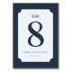 This elegant table card design features a sophisticated and timeless style, perfect for a wedding celebration. The large, bold number "8" takes center stage with a minimalist yet refined typography that complements the clean layout. Set against a crisp white background framed by navy blue borders, the color palette exudes classic charm and formality. The mood is one of understated elegance, ideal for creating an inviting atmosphere at your special event. Customize this design to add personal touches, making it a beautiful addition to any wedding reception setup.