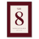 This elegant wedding table card features a sophisticated maroon and cream color palette, creating an air of timeless elegance. The design centers around a large, stylish number "8," surrounded by refined typography that adds to the classic feel. Perfect for a formal or traditional wedding setting, this card exudes grace and simplicity, ensuring it complements any decor while maintaining a focus on understated luxury. Its clean lines and harmonious colors make it ideal for couples aiming for a polished and memorable celebration.