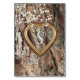 Lindo cartão de mesa rústico com casca de árvore, flores brancas e um coração esculpido a ouro. RSVP e convites combinando também disponíveis.