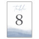 Números de mesa costeiros elegantes para o seu casamento ou evento especial apresentam um gradiente de aquarela azul empoeirado translúcido ao longo da parte inferior com uma curva graciosa que evoca o fluxo e refluxo do mar.
