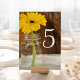 Personalize essas encantadoras e elegantes margaridas amarelas nos Números de tabela de casamentos da barninha do Mason Jar Country para cada mesa no estilo de fazenda rural ou no tema de rancho, recepção de casamentos, chá de panela ou festa de celeiro de noivado. Estes cartões de mesa personalizados, relaxados e rústicos, apresentam uma fotografia floral acesa de uma flor margarida amarela num pote de latas de vidro e um fundo de madeira de celeiro de castanho.