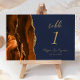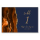 A borda esquerda desta elegante e moderna placa de número da mesa de casamento apresenta uma borda de cor de água laranja queimada, aparada com falsa brilho dourado. O texto personalizável combina manuscrito de pincel dourado e fontes sans serif em um fundo azul marinho.