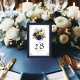 Elevem a vossa decoração de casamento com este elegante cartão azul de marinho e de mesa floral de ouro. Apresentando sofisticados sofisticados sotaques florais azuis e dourados e tipografia clássica, este cartão numérico da tabela adiciona um toque luxuoso às suas mesas de recepção. Personalize-o com os nomes dos casais e a data do casamento para um olhar maravilhosamente coordenado que melhora o seu elegante tema do casamento.