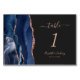 A borda esquerda desta elegante e moderna placa de número da mesa de casamento apresenta uma marinho azul de aquarela agata borda aparada com falso rosa dourado. O texto personalizável combina a escrita manual cor-de-rosa-rosa, as fontes itálicas e de impressão em um plano de fundo não preto.