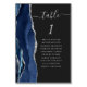 A borda esquerda desta elegante e moderna placa de número da mesa de casamento apresenta uma marinho azul de aquarela agata borda aparada com falso brilho prateado. A palavra "mesa" aparece em um guião de escrita manual de cinzas prateadas sobre fundo preto. Adicione os nomes dos seus convidados que estão atribuídos a cada mesa.