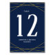 Esta placa de número da mesa de casamento oferece um design elegante com linhas de ouro que criam formas geométricas em um fundo azul marinho. O número aparece em texto branco junto com texto para os nomes da noiva e do noivo e sua data de casamento.