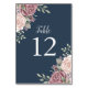 Esta elegante placa de número de tabela tem rosas de aquarela pintadas manualmente em tons de rosa claro e rosa poeirento em um fundo azul marinho. Você pode alterar o estilo e a cor da fonte, conforme desejar. Isto é parte de uma suíte de casamento que pode ser totalmente personalizada.