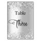 O número da tabela é escrito com um script de estilo elegante com letra manual. Letras pretas, fundo branco na frente e fundo prateado sujo com poeira brilhante fraca, brilha no verso.