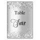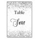 O número da tabela é escrito com um script de estilo elegante com letra manual. Letras pretas, fundo branco na frente e fundo prateado sujo com poeira brilhante fraca, brilha no verso.