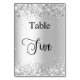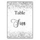 O número da tabela é escrito com um script de estilo elegante com letra manual. Letras pretas, fundo branco na frente e fundo prateado sujo com poeira brilhante fraca, brilha no verso.