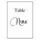 O número da tabela é escrito com um script de estilo elegante com letra manual. Letras pretas, fundo branco. Este número de tabela também está disponível em rosa gold.