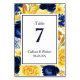 Este cartão de número da mesa de casamento tem uma borda de flores aquarelas e folhagem em marinho azul e amarelo, com toques de azul claro e verde. Seu texto personalizado está em azul escuro no centro em quatro campos. A parte traseira da placa é idêntica à da frente. *Este design usa trabalho de arte de LABFcreations.