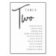 Cartões simples e chic em preto e branco clássico fazem uma declaração elegante no seu casamento ou evento. Design apresenta "mesa [number]" em uma combinação de olhares de serif clássica e de caracteres de script manuscritos, com nomes individuais de convidados por baixo. Design repete-se de ambos os lados. Cartões numerados individualmente vendidos separadamente; solicite cada número de tabela individualmente da nossa coleção.