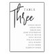 Cartões simples e chic em preto e branco clássico fazem uma declaração elegante no seu casamento ou evento. Design apresenta "mesa [number]" em uma combinação de olhares de serif clássica e de caracteres de script manuscritos, com nomes individuais de convidados por baixo. Design repete-se de ambos os lados. Cartões numerados individualmente vendidos separadamente; solicite cada número de tabela individualmente da nossa coleção.
