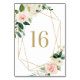 Número da Mesa de Flores Geométricas em Aquarela da Primavera 16 | Número de mesa elegante e feminino com ilustrações em aquarela de rosas e peônias brancas, pêssego e rosa, acentos de folhagem e moldura geométrica em folha falsa. Este número de mesa floral é perfeito para eventos de primavera e jardim.