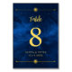 Esta placa numérica da Tabela apresenta detalhes de ouro amarelo em um fundo azul do céu à meia-noite. Você pode adicionar seus detalhes clicando no botão personalizar. Isto é parte de uma suíte de casamento que pode ser totalmente personalizada.