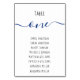 Na parte superior, há o número da tabela escrito em um guião marinho azul de escrita manual e a palavra Mesa acima, em bonés pretos menores (letras de mão). Sob eles, há os nomes de hóspedes, em letras negras semelhantes.