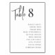Cartões simples e chic em preto e branco clássico fazem uma declaração elegante no seu casamento ou evento. Design apresenta "mesa [número]" em letra de script manuscrita, com nomes de convidado individuais abaixo na tipografia da serif do eterno. Design repete-se de ambos os lados.
