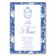 Delft blue floral table number card, designed in a refined blend of chinoiserie and French toile de Jouy style. The soft botanical illustrations frame an arched layout featuring an elegant wedding crest monogram, perfect for couples who love vintage, historic, and European-inspired aesthetics. Classic script typography pairs beautifully with the ceramic-blue palette, making this design an effortless nod to the tradition of “something blue.” Fully customizable with your guest's names, wedding crest and in this design table number: Nine, it’s an exquisite choice for any romantic or sophisticated wedding theme.