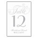 Cada placa numérica da tabela deve ser personalizada e adicionada individualmente ao carrinho de compro. Cinza de prata elegante design em fundo branco apresenta um belo roteiro escrevendo com um monograma de casamento / número de mesa que aparece em ambos os lados do cartão.