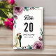 Este elegante número de mesa floral de aquarela é perfeito para um casamento moderno. A design romântica apresenta uma elegante estrutura floral de aquarela com uma ilustração noiva e noiva e caligrafia preta sobre fundo branco.