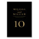 Elegante Black Dourado & Bride Table Number. Design luxuoso com nomes de noiva e noivo dourados personalizáveis, data de casamento e número de tabela, a preto (pode ser qualquer fundo colorido ). Convidamo-lo a visitar a nossa loja Zazzle, Austen & Grace, para ver a suíte de casamento de cheios, produtos correspondentes e muito mais.