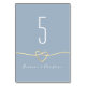 Simples, minimalista, moderno, elegante número de mesa de noivado azul desbotado com coração de corda dourada romântica e nomes dos noivos.