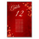 Este cartão de número de tabela de assentos de casamento chinês apresenta flores de cereja vermelha bonito e um símbolo de felicidade dupla dourada em um fundo vermelho rubi brilhante. Com caixas de texto para adicionar uma lista de nomes de convidados.