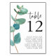 Elegante Eucalyptus Script Casamento de Nomes de Convidados Casando. A mesa está em um script de estilo de escrita manual definido e o número da sua tabela abaixo, e as folhas de eucalipto azul lacrimogêneo correm no lado esquerdo. Personalize facilmente o número e os nomes de convidados. O mesmo design também está atrás.