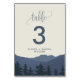 Este cartão de número de mesa de retiro para as montanhas é perfeito para um casamento moderno. O design apresenta uma serena cordilheira em aquarela azul com uma floresta de árvores perenes em primeiro plano. O cartão imprime na frente e no verso (dupla face). Adicione cada número de mesa que você precisa ao carrinho individualmente.