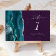 A borda esquerda desta elegante e moderna placa de número da mesa de casamento apresenta uma cor azul-lacrimogênea, borda com falso brilho prateado. O texto personalizável combina a escrita manual de cinzas prateadas, as fontes itálicas e em placas em um fundo roxo.