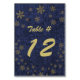 Cartão de número da mesa de festas de feriado elegante feito em azul real sobre fundo azul-marinho, com flocos de neve dourados. O texto em amarelo ouro está pronto para personalizar a sua festa de Natal.