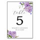 Elegante e moderno número da mesa de núpcias com ilustração aquosa de flor de púrpura com verde. Perfeito para um casamento de primavera ou verão.