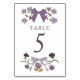 Número da mesa de casamento boho e rústica com ilustração desenhada à mão de fitas com flores em lilás.