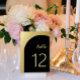 Um sinal elegante de mesa de casamento preto e brilhante de fundo em ouro, número 3,5x5polegadas, com um simples fundo ombre com números de na moda. Ideal para casamento moderno de temas cor-de-rosa e eventos de moda.