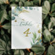A palavra "mesa" está no estilo caligráfico e o número correspondente está rodeado pela natureza. Glitter de ouro simulado.