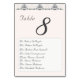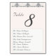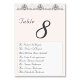 Design apresenta um fundo cor-de-rosa champanhe para o título e o número da tabela. O número da tabela é exibido em fontes grandes e fáceis de ver. Os nomes para oito convidados são exibidos abaixo em uma fonte Nupcial elegante contra um fundo branco. Projetado para coordenar com a "Suíte de Casamento Católico de Lace Rosa-Champagne".