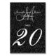 Este cartão de número da mesa de casamento preto e branco é elegante e sofisticado. O fundo tem um aspecto brilhante preto, como as estrelas, ajudando a tornar esta carta ainda mais especial. Personalize com seus nomes de noiva e noivo, sobrenome de recém-casados, data inicial do monograma e do casamento. Um cartão único que também pode ser utilizado como guardiã. Design por Elke Clarke ©. Design de brilho do efeito fotográfico impresso. Encomende um por mesa com cada número de tabela, mas ainda recebe o desconto em massa para o número total solicitado. Outras cores disponíveis a pedido. (Nota: Esta placa não contém brilho sujo e é um impressão de reprodução gráfica.) Consulte mais designs em Zazzle.com/monogramgallery. Este design original assinado, de Elke Clarke, popular desde 2007, é agora atualizado adicionando um efeito fotográfico de fundo reluzente.