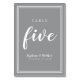 Esta design foi criada para comemorações íntimas de casamento. A design da Tabela de Casamento Simples, Mínima e elegante, número CINCO, apresenta um design contemporâneo com uma dupla borda de quadros em branco nítido sobre um sofisticado fundo de cinza. O design de chic oferece eterno, mas sofisticação moderna. Personalize a design de mesa de casamento com seus detalhes de casamento em letras brancas nítidas e roteiro. A parte traseira da placa é uma duplicata da parte frontal. Encomenda um para cada mesa com os números de tabela individuais. O Mesa ONE to TEN foi projetado individualmente e está disponível em nossa loja InvitationSuites no Zazzle. Embora tenha criado especificamente a um local menor, se precisar de números adicionais, envie-nos um e-mail para InvitationSuites@gmail.com.