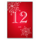 Cartão de número da mesa de flocos de neve vermelhos e brancos para complementar o jogo de casamento.