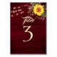 Número de mesa rústico elegante e moderno de madeira de celeiro burgundy com girassol, renda floral dourada e luzes de corda.