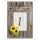 Cartões de número de mesa com estilo country e western com madeira desgastada e girassóis para o seu casamento.