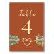 Boho, moderno, simples caligrafia terracota número de mesa laranja queimada, com corda dourada em forma de coração e folhagem de eucalipto rústica em aquarela.