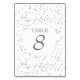 Estes números de mesa elegantes apresentam delicado confete de poeira de estrelas prateado. Personalize com seus detalhes em letras prateadas elegantes. Perfeito para casamentos, chá de noiva, chá de bebê, batizados, festas de noivado, celebrações de aniversário, formaturas, encontros de aniversário e outros eventos especiais ao longo do ano! Criado por Pure Piglet© em www.zazzle.com/purepiglet*