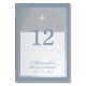 Número de mesa para a primeira comunhão de um rapaz, com fundo azul empoeirado e texto e cruz de prata falsa e arco. O nome está escrito numa caligrafia.