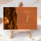 A borda esquerda desta elegante e moderna placa de número da mesa de casamento apresenta uma borda de cor de água laranja queimada, aparada com falsa brilho dourado. O texto personalizável combina as fontes de letra alta, itálico e compacta em um fundo laranja queimado.