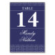 Cartão gráfico da mesa de casamento em azul escuro e branco. Uma ideia excelente para ajudar os convidados a encontrar seus assentos no seu casamento. Personalize com seus nomes e data de casamento. Design original de Sarah Trett.