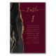 A borda esquerda desta elegante e moderna placa de número da mesa de casamento apresenta uma borda de agata preta aparada com falsa brilho dourado. A palavra "mesa" aparece em um guião de escrita manuscrita dourada em fundo vermelho burgundy. Adicione os nomes dos seus convidados que estão atribuídos a cada mesa.